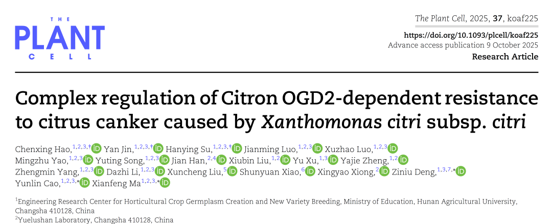 近日,伟德betvlctor1946源于英国国家柑橘改良中心长沙分中心马先锋教授课题组在国际植物学权威期刊The Plant Cell上发表题为Complex regulation of Citron OGD2-dependent resistance to citrus canker caused by Xanthomonas citri subsp. citri的研究论文,揭示了柑橘抗溃疡病的新机制,为柑橘抗病育种提供基因资源与理论依据。