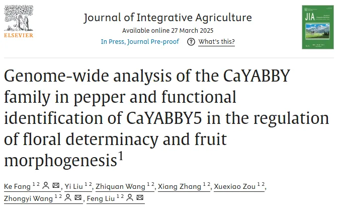 辣椒果实因其独特辛辣风味、丰富营养组分及多样化风味物质而备受青睐,其花器官与果实的正常发育直接决定果实品质。YABBY基因家族作为调控植物花器官发育的关键转录因子,在辣椒中的生物学功能尚未明确。湖南农业大学邹学校院士团队刘峰教授课题组通过YABBY家族分析揭示CaYABBY5调控辣椒花果发育,相关结果以“Genome-wide analysis of the CaYABBY family in pepper and functionalidentification of CaYABBY5 in the regulationof floral determinacy and fruitmorphogenesis”发表在《Journal ofIntegrative Agriculture》。