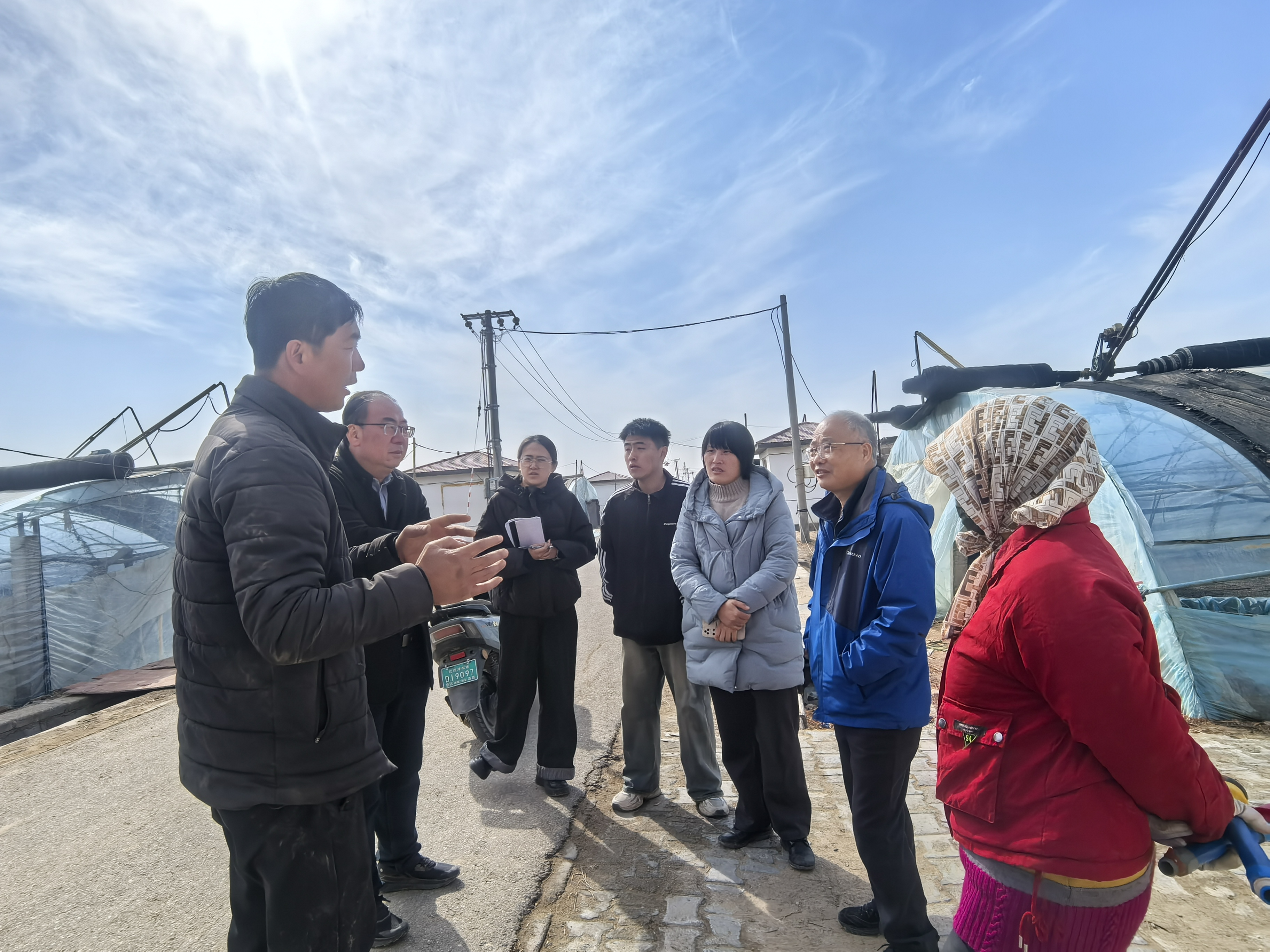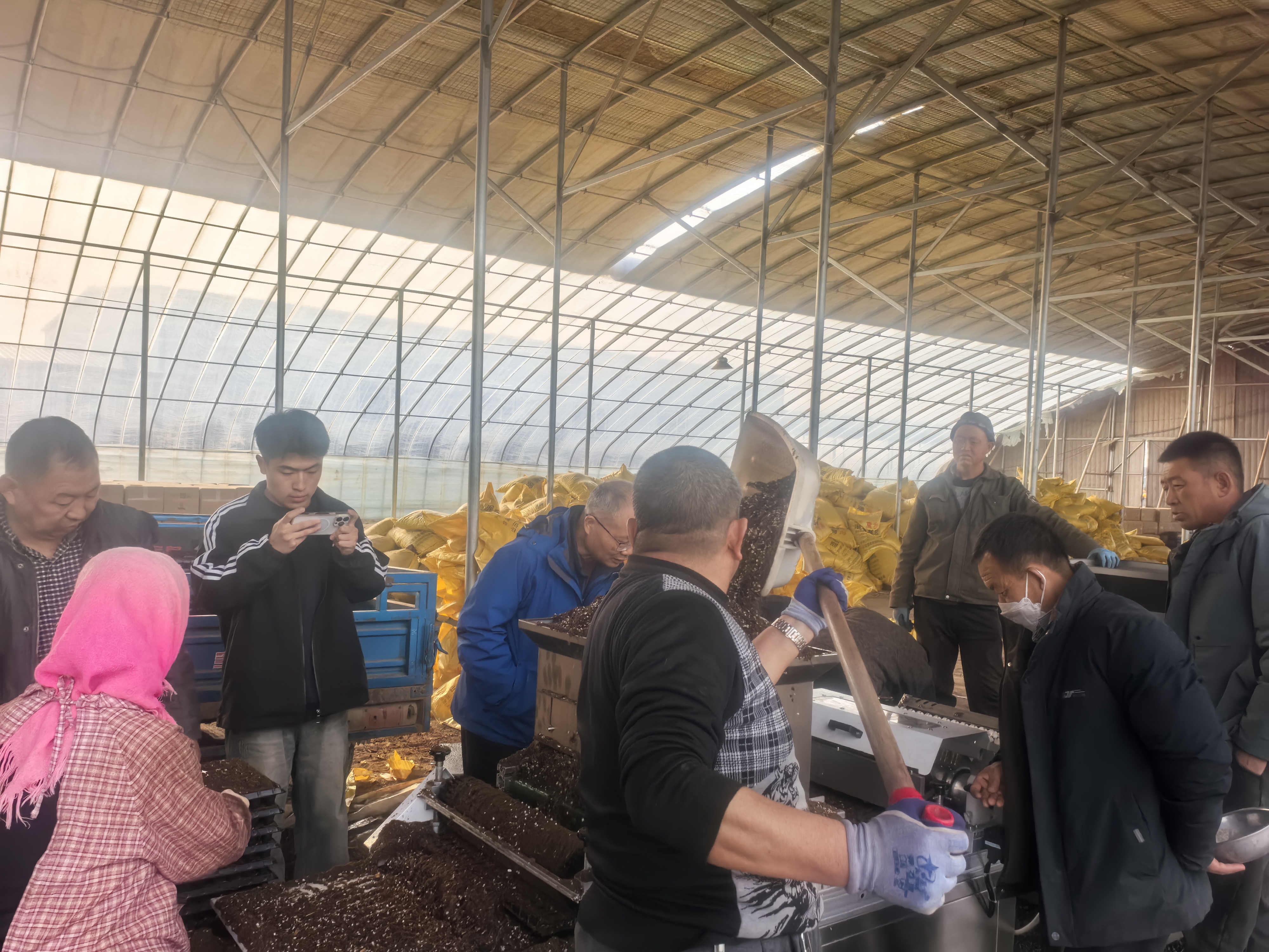 随后,团队来到杭锦后旗康尔徕育苗基地、杨香益诚育苗大棚,与当地农户交流,开展技术指导。在集约化育苗的“联村育苗”共富模式下,康尔徕育苗基地全村40户通过利用标准化育苗大棚,每户年均收入达16-20万元。在交流中,针对育苗难题,两位专家结合当地盐碱化土壤特点,提出规划机械化穴盘育苗路线、建立水肥一体化滴灌系统、引入株型调控技术等方案,帮助当地农户增强植株抗逆性与整齐度、移栽效率与成苗质量。