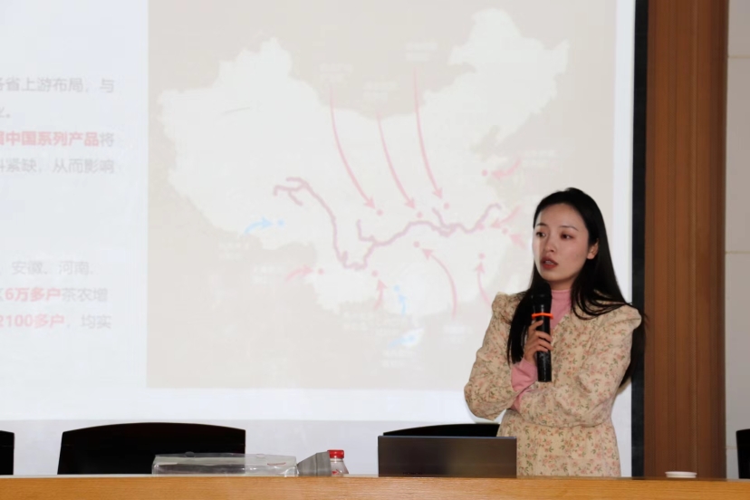 在本次校园宣讲会中,来自正山堂公司的陈女士从历史、生态优势、品质、资源和文化五个角度进行交流,向我校2024届茶学专业毕业生阐述了“带动红茶全面复兴”的目标,以及开启红茶清饮新风尚的愿景。