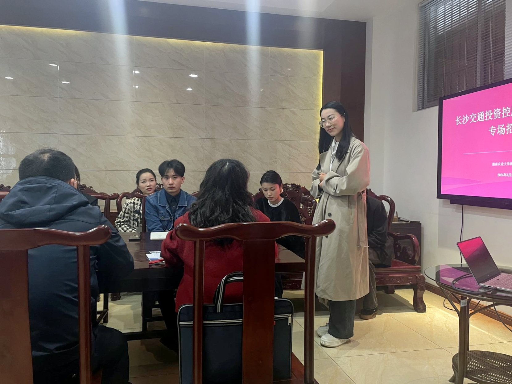 在本次招聘宣讲会中,来自长沙市交通投资公司的领导人从个人能力、兴趣和社交等多个角度与我院2024届应聘毕业生进行交流,向应聘者展示了“助力培养新生代综合人才”的目标,并表达打造与时俱进的职场文化的愿景。